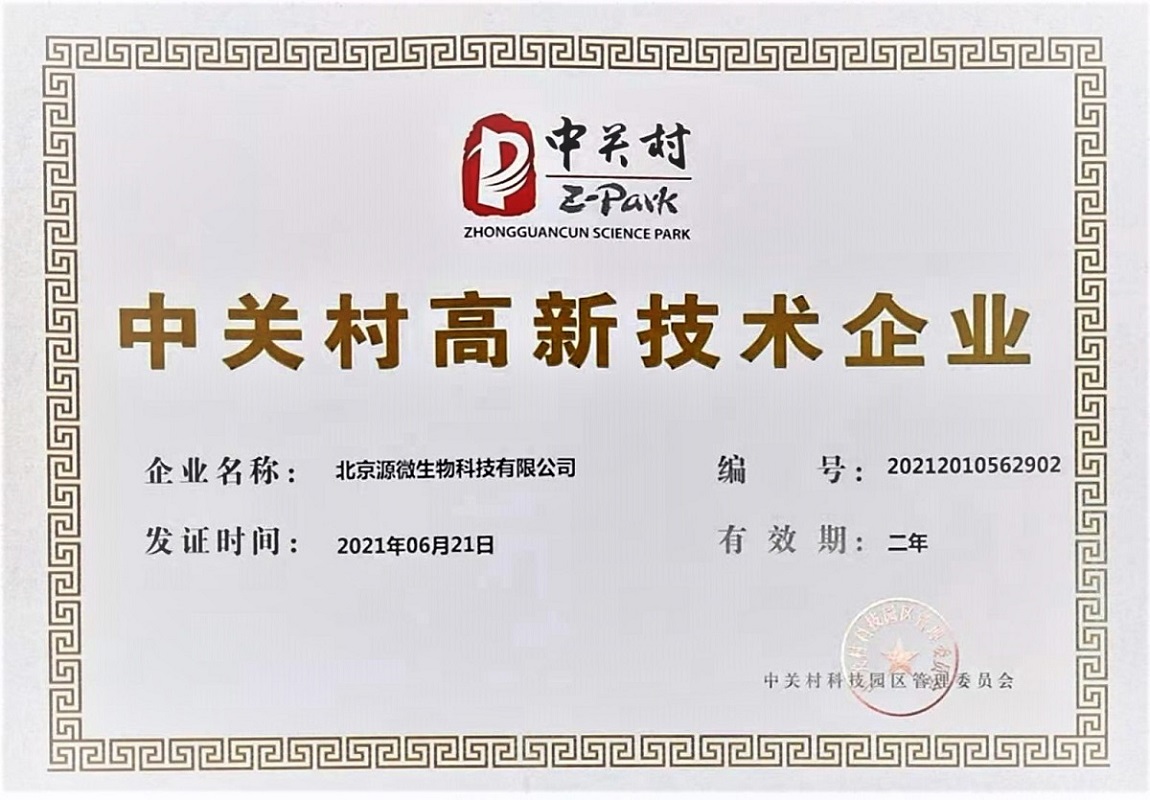 2021年6月21日,北京源微生物科技有限公司通過中關村科技園區管理委員會審核、認定,獲得“中關村高新技術企業”證書,這是對我司技術創新發展的一種認可,我們會繼續努力奮斗,不斷提升和增強企業的自主創新能力,為公司、為社會創造更大的價值。